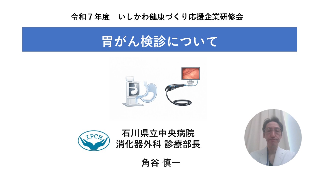 「胃がん検診について」と題して、石川県立中央病院の角谷慎一先生に講演をしていただきました。働く世代では職場でのがん検診が重要な役割を果たしております。国が作成した「職域におけるがん検診に関するマニュアル」についてもご説明いただきましたので、会員企業様のご参考になればと考えております。